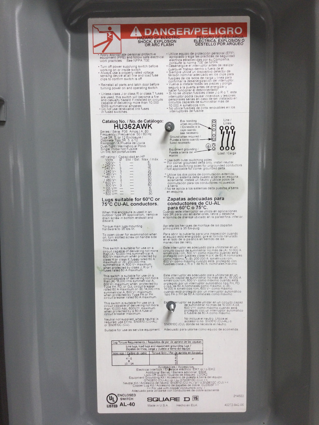 Introducing the Square D HU362AWK Type HU Disconnect Switch! With its 60 Amp, 600v rating and 3 Pole, 3 Phase design, this switch is perfect for non-fusible applications. Its Nema 12 Series F06 construction ensures durability and reliability. Trust in Square D for all your electrical needs.