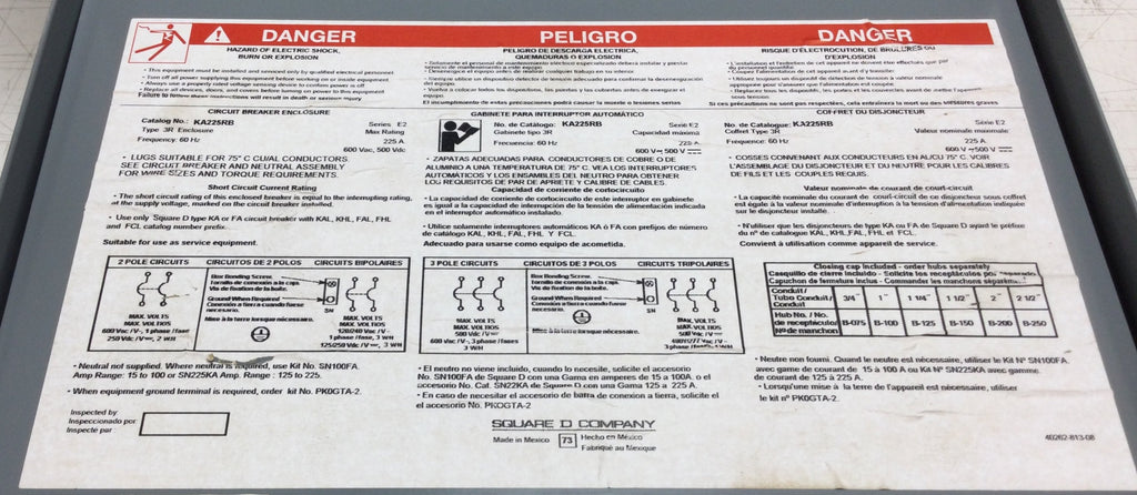 Introducing the Square D KA225RB Nema 3R Enclosure, designed for maximum protection and performance. With a 225 Amp circuit breaker and 600 VAC max capacity, this enclosure is perfect for use with KA or FA types. Durable and reliable, it ensures safe and efficient operation for your electrical systems.