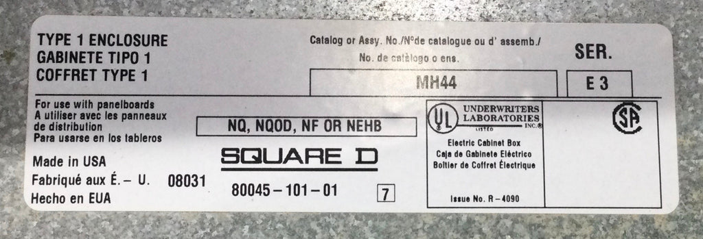 The Square D MH44 Type 1 Panelboard Enclosure measures 44" x 20" and is designed to house NQ and NF series panelboards safely. Its Type 1 rating ensures protection against light dust and indoor conditions, making it ideal for commercial and industrial electrical installations.