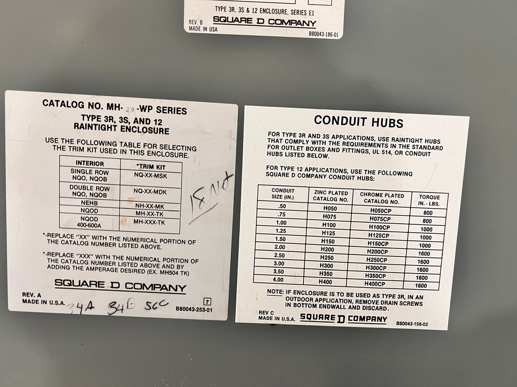 Square D NQOD/NQOB/NQO Panelboard 225 Amp 208Y/120VAC 3 Phase 4 Wire 36 Space with MH29WP Enclosure Missing Deadfront