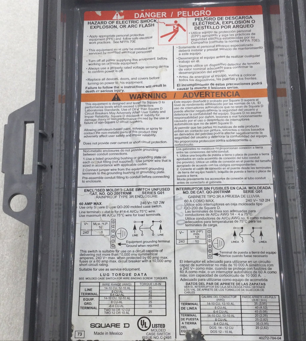 Square D QO-200TRNM 60 Amp 2 Pole 1 Phase 120/240V Disconnect 8 3/4" x 5 1/2"