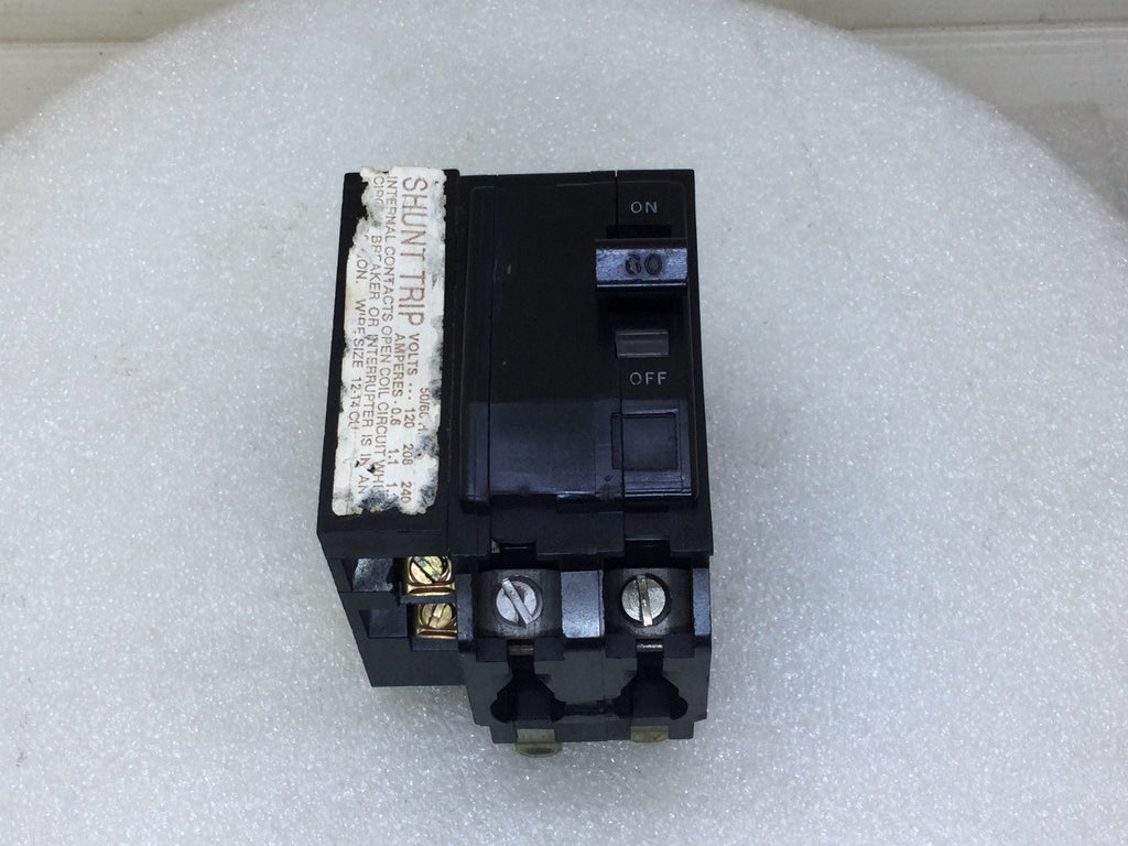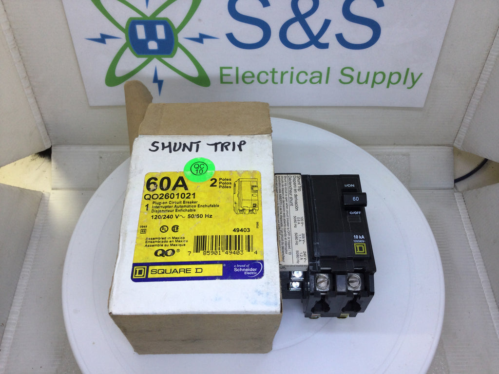Square D 2P Shunt Trip Plug In Circuit Breaker 60A 120/240VAC, QO2601021 USEDTHANK YOU FOR SHOPPING WITH US, WE LIST 1000’S OF BREAKERS. PLEASE VISIT OUR STORE FOR MORE CHOICES. http://stores.shop.ebay.com/S-S-Electric-Supply BRANDS WE CARRY: EATON, SQUARE D, CUTLERHAMMER, WESTINGHOUSE, BRYANT, SIEMENS, FRANK ADAMS, ZINSCO, FPE, GENERAL ELECTRIC, WADSWORTH, GENERAL SWITCH, SYLVANIA, CROUSE HINDS, I.T.E. THANK YOU FOR SHOPPING WITH A LOCAL AMERICAN OWNED COMPANY