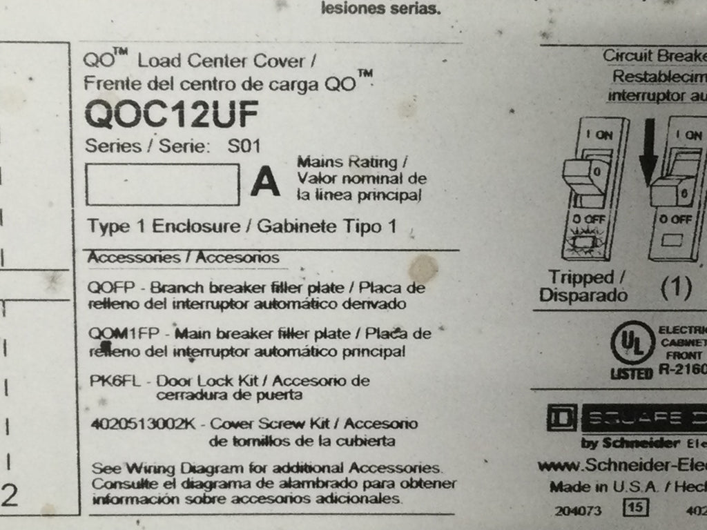 Square D QOC12UF Cover/Door Only with Main 12 Space