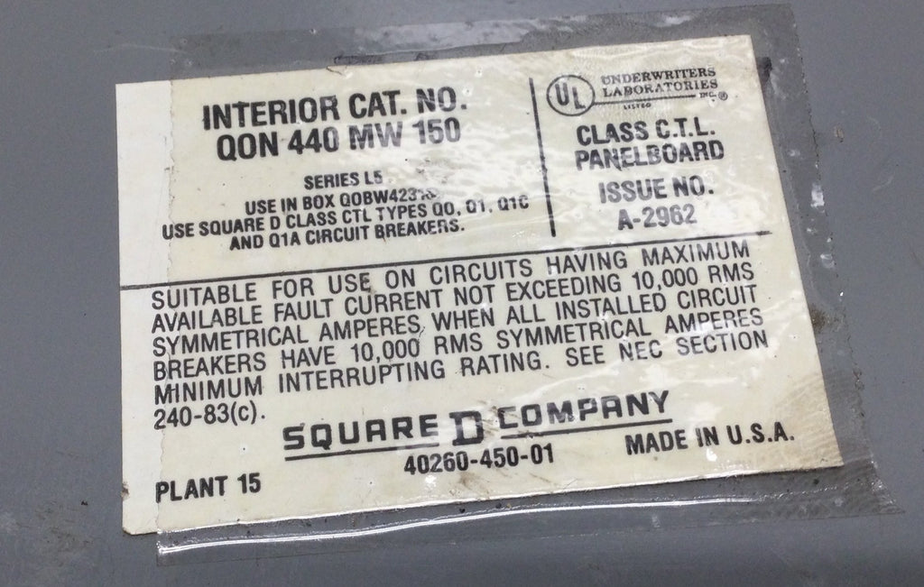 Square D QON440MW150 150 Amp 3 Phase 20 Space Load Center Guts Only 6" X 29"