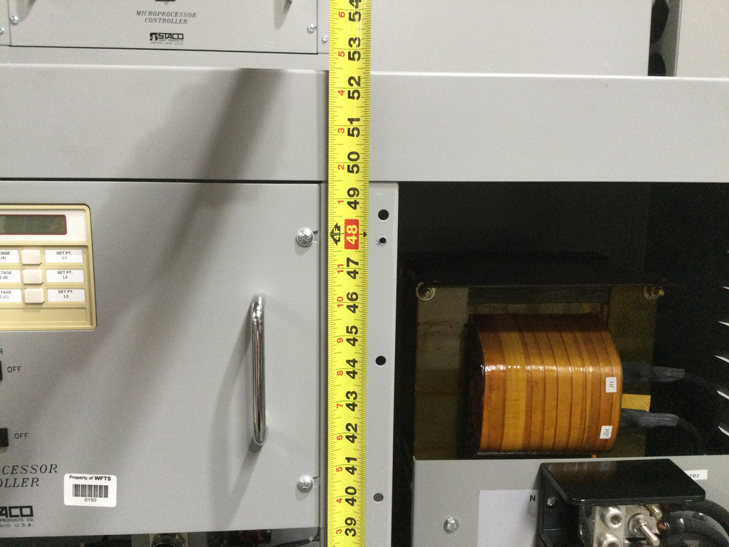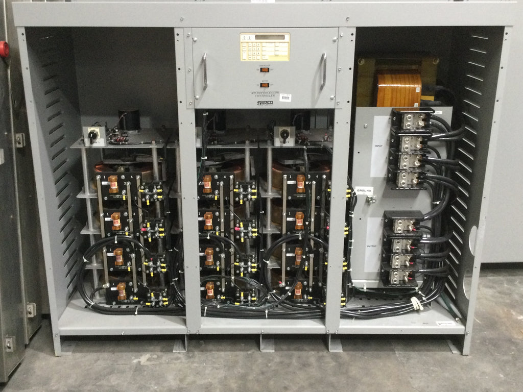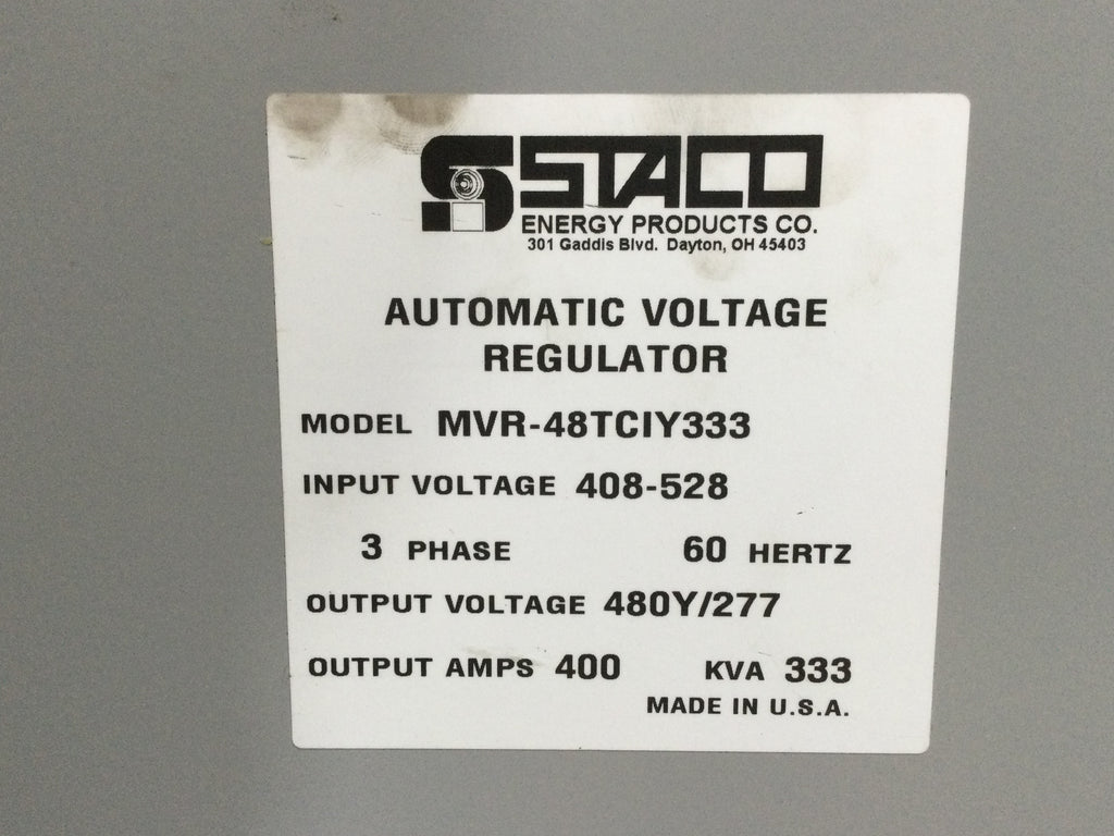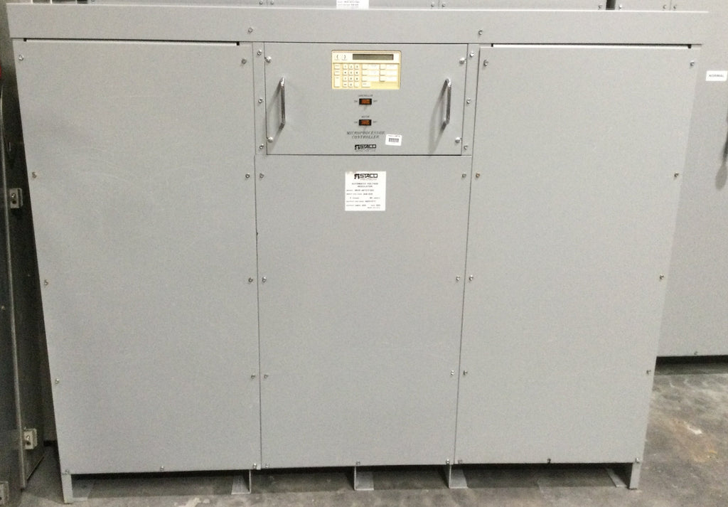 Staco Energy MVR-48TCIY333 400 Amp Input 408/526V Output 480Y/277V 3 Phase KVA333 Voltage Regulator 52.5" x 64.5" Model 034-8348 This industrial-grade voltage regulator is designed to deliver consistent voltage, stability, and reliability for your operation.