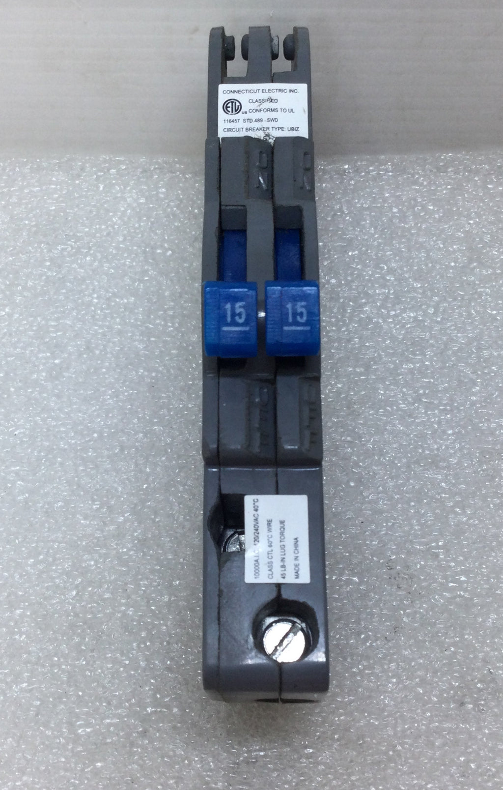 The Connecticut Electric UBIZ-0215 is a 1-pole tandem circuit breaker rated for 15/15 amps at 120/240 volts. Designed for efficient use of panel space, this breaker provides reliable overcurrent protection in residential and commercial electrical systems. Its tandem configuration allows for installation in panels with limited slots, ensuring safe and code-compliant circuit management.