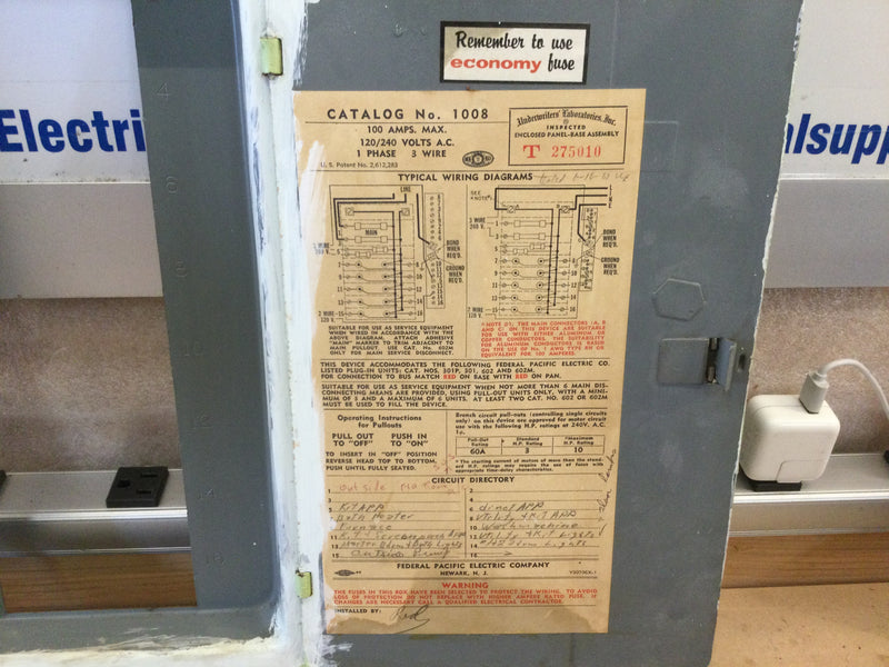 Fpe Federal Pacific Electric Cat No.1008 100amp 120/240v T275010 Panel Door Cover