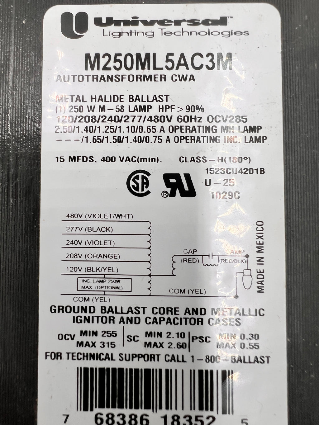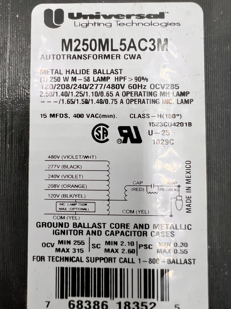 The Universal Lighting Technologies M250ML5AC3M500K is a magnetic core and coil ballast designed for metal halide lamps. Here are the key specifications: