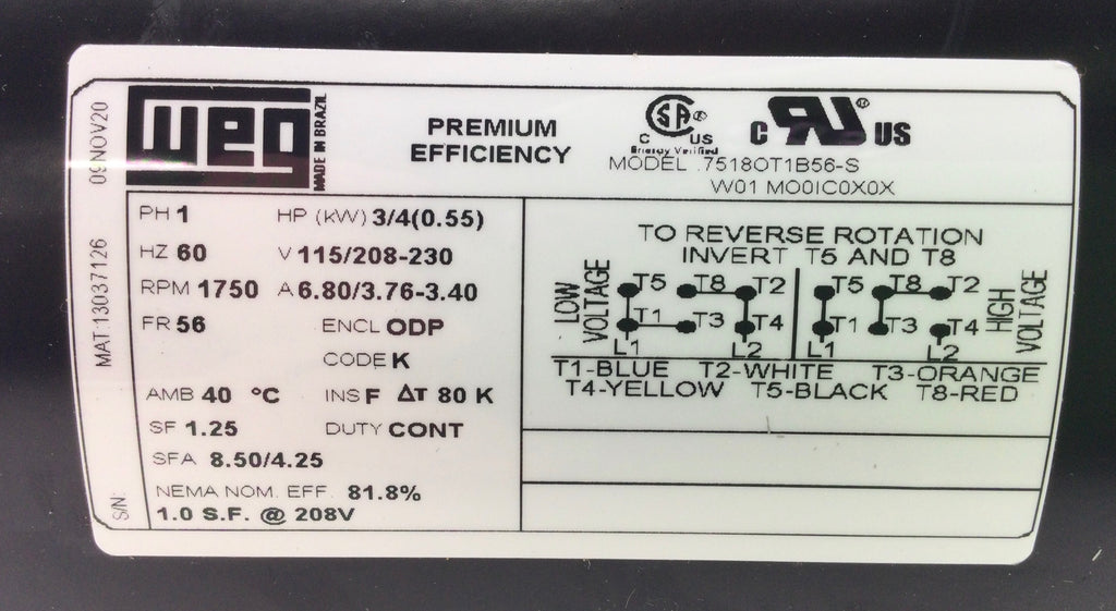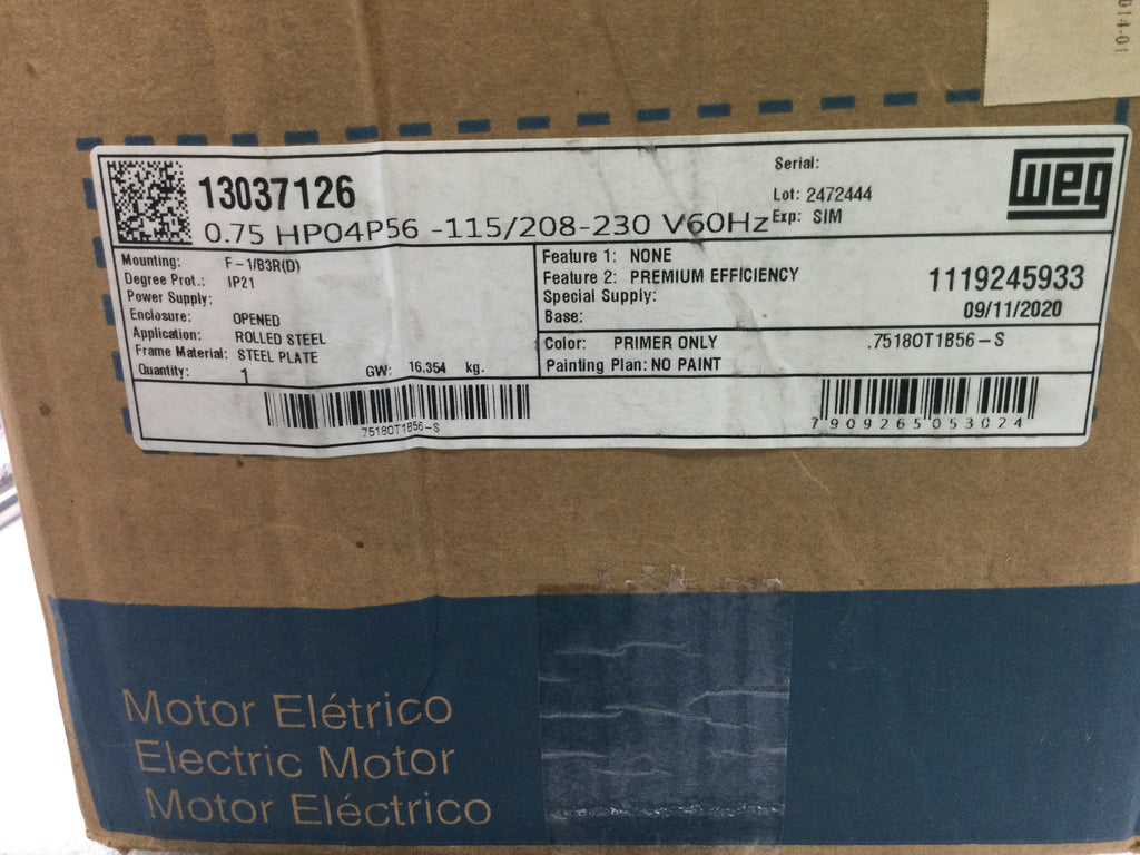 WEG .75180T1B56-S 40 Amp 1-Phase 230V Induction Electrical Motor