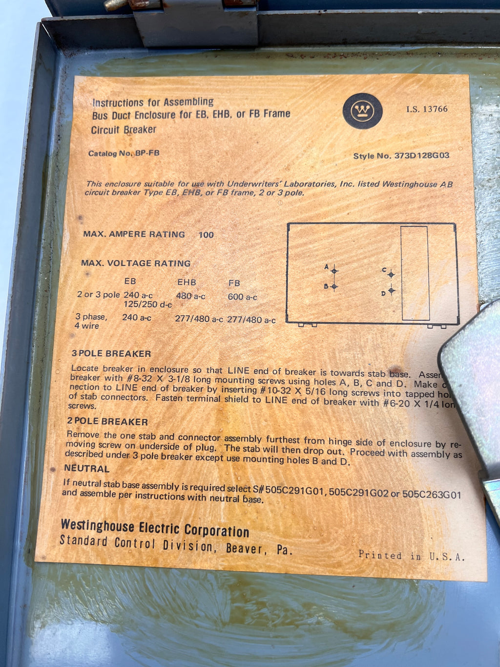 Westinghouse 373D128G03 BP-FB 100 Amp 600V Busway Circuit Breaker Enclosure