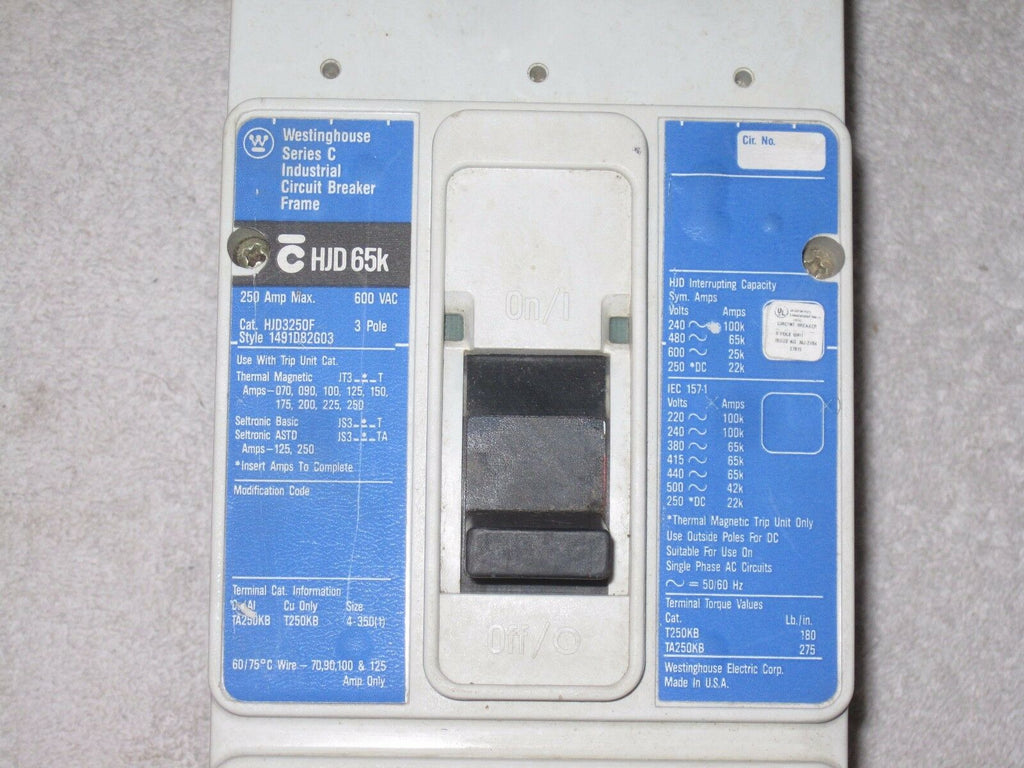 Westinghouse Hjd3250f W/Jt3175t Trip Circuit Breaker, 3-Pole 250amp, 600v 65k