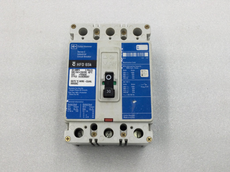 Cutler Hammer HFD3030 30 Amp 3 Pole 600v HFD 65k Circuit Breaker