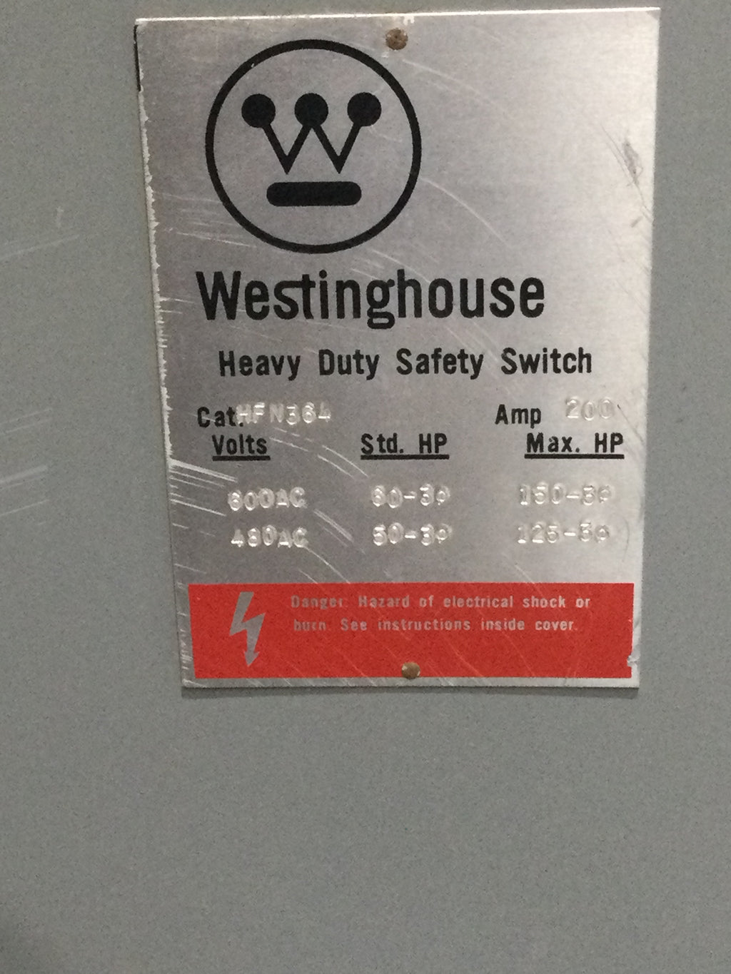 Westinghouse HFN364 200 Amp 600V 3 Phase Safety Switch 36" x 13" indoor  type 1 enclosure