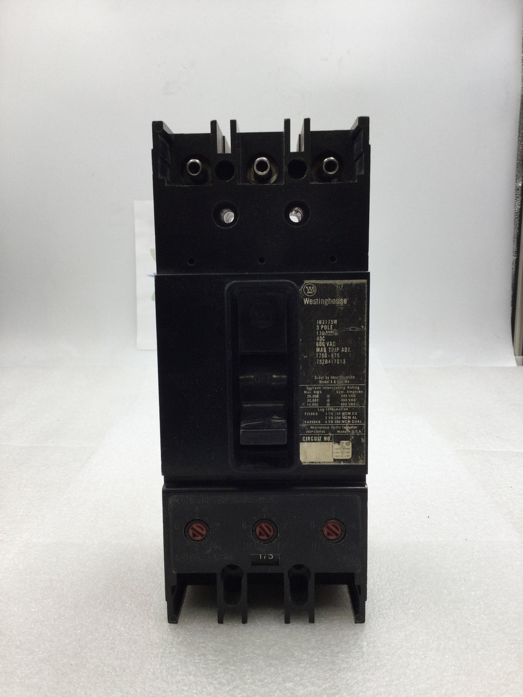 Westinghouse JB3175W 175 Amp 3 Pole 600V Magnetic Trip Breaker - Cosmetic Flaw