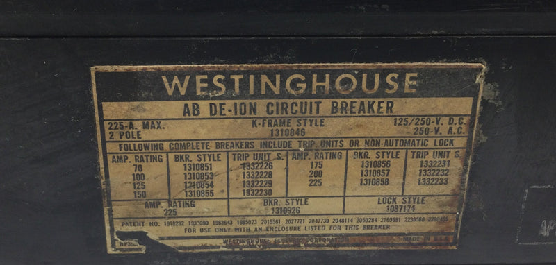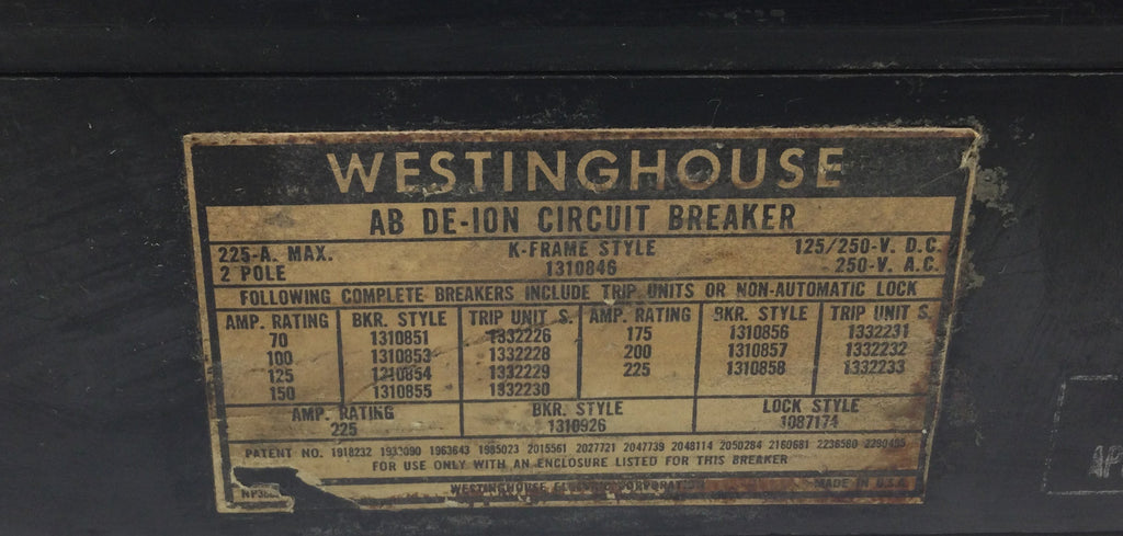 Westinghouse K Frame 225 Amp 2 Pole 600V Breaker with 175 Amp Trip