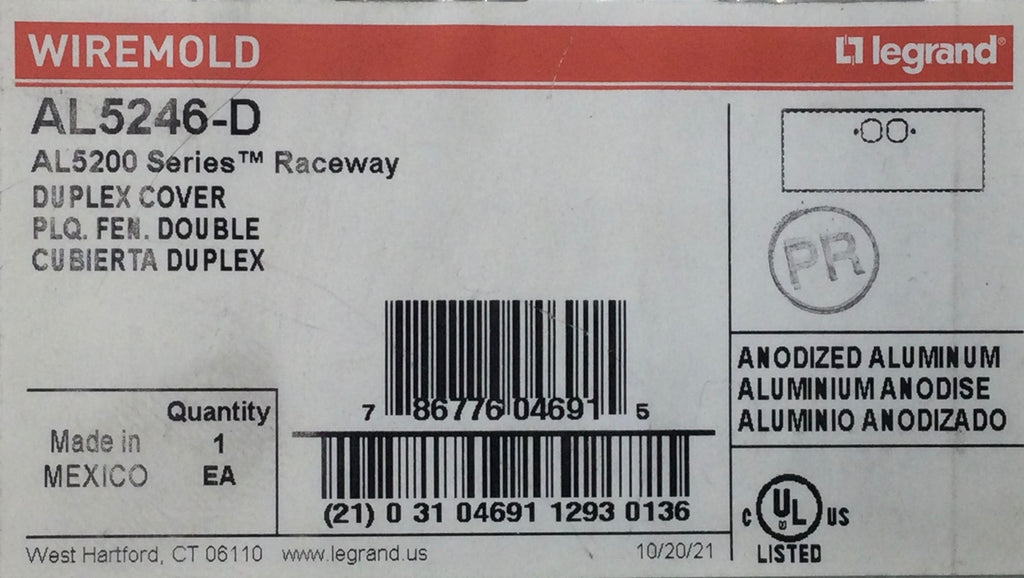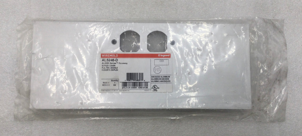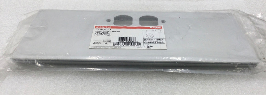 Wiremold/Legrand AL5246-D duplex cover designed for AL5200 series raceway systems. Provides a finished appearance while protecting electrical connections in commercial and residential installations. Compatible with standard duplex outlets, this cover integrates seamlessly with aluminum raceway channels for clean cable management.