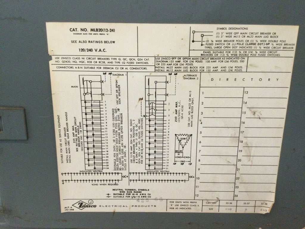 Zinsco Sylvania MLB20(12-24) 225 Amp 120/240v Main Breaker Panel Cover MLB20(12-24)C 23 1/8" x 14 1/4"